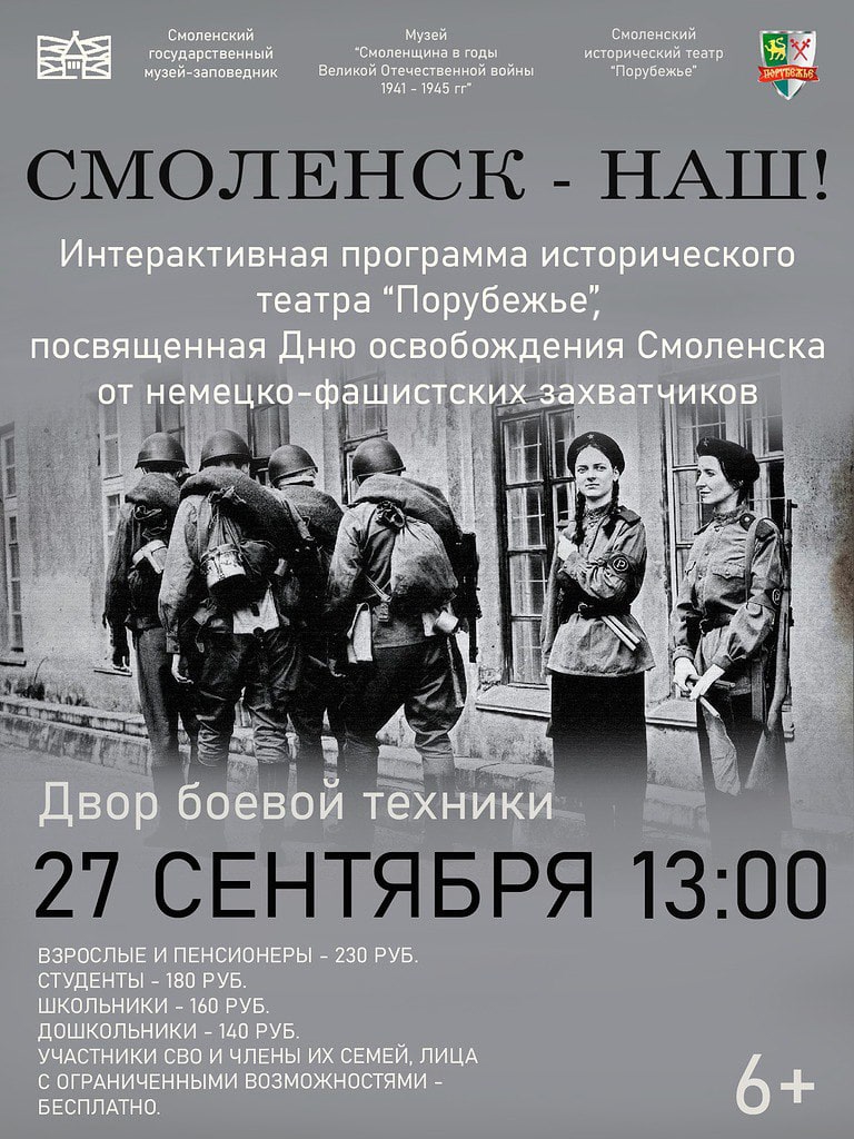 27 сентября в 13.00 во дворе музея «Смоленщина в годы Великой Отечественной войны» (г. Смоленск, ул. Дзержинского, 4а) исторический театр «Порубежье» представит вниманию зрителей интерактивную программу «Смоленск – наш!», посвященную Дню освобождения Смоленщины от немецко-фашистских захватчиков.