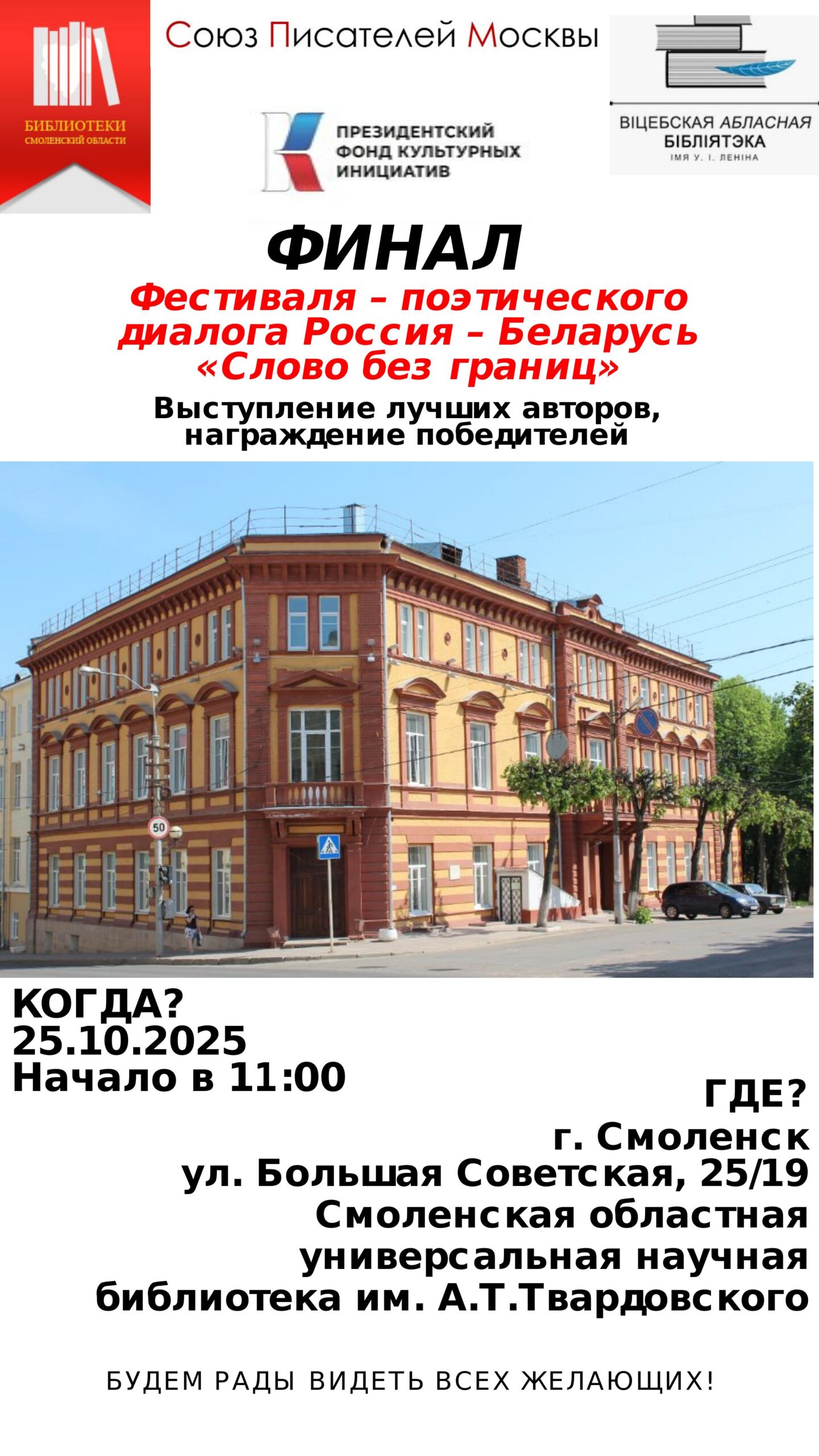 Фестиваль, организованный Союзом писателей Москвы совместно со Смоленской областной библиотекой имени А. Т. Твардовского, направлен на поддержку талантливых поэтов и развитие культуры Смоленской области и Беларуси, на повышение интереса у населения к современной русской литературе и привлечение внимания к поэзии читателей и общественности.