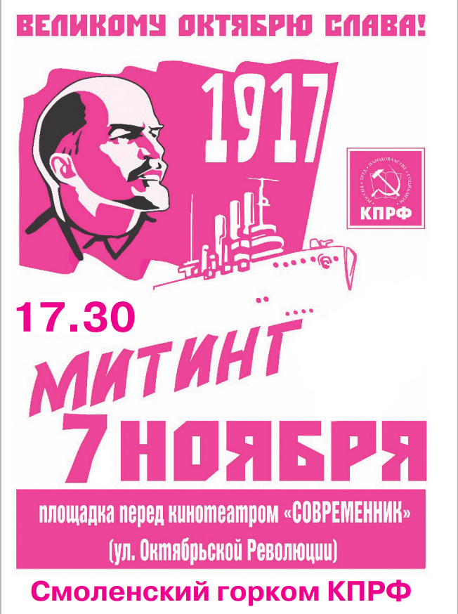 7 ноября в 17.30 в Смоленске на площадке перед кинотеатром «Современник» (улица Октябрьской Революции) состоится митинг, посвящённый 108-й годовщине Великого Октября, организованный городским отделением КПРФ.