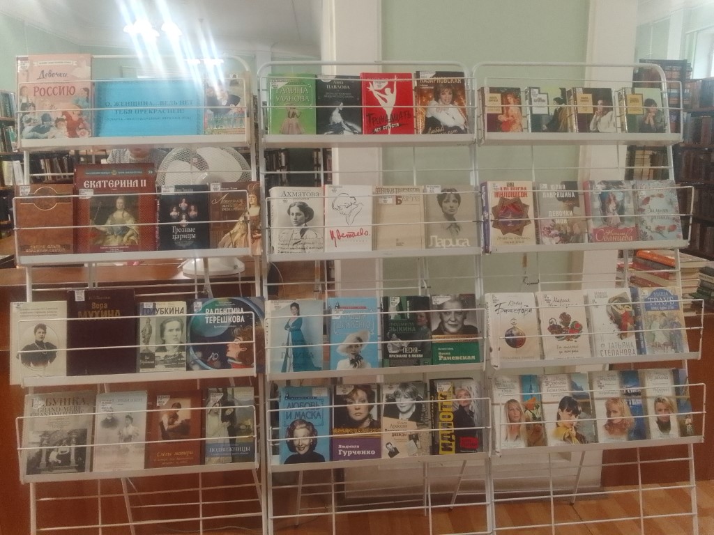На выставке представлены книги о великих женщинах разных эпох, оставивших яркий след в истории страны, произведения российских женщин-писательниц.
