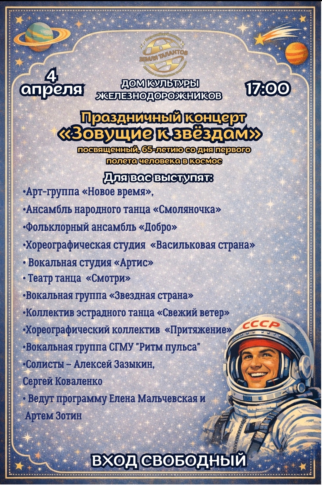 В субботу, 4 апреля, в 17.00 во Дворце культуры железнодорожников (г. Смоленск, Витебское шоссе, д. 10) состоится праздничный концерт, посвященный 65-летию первого полета человека в космос.